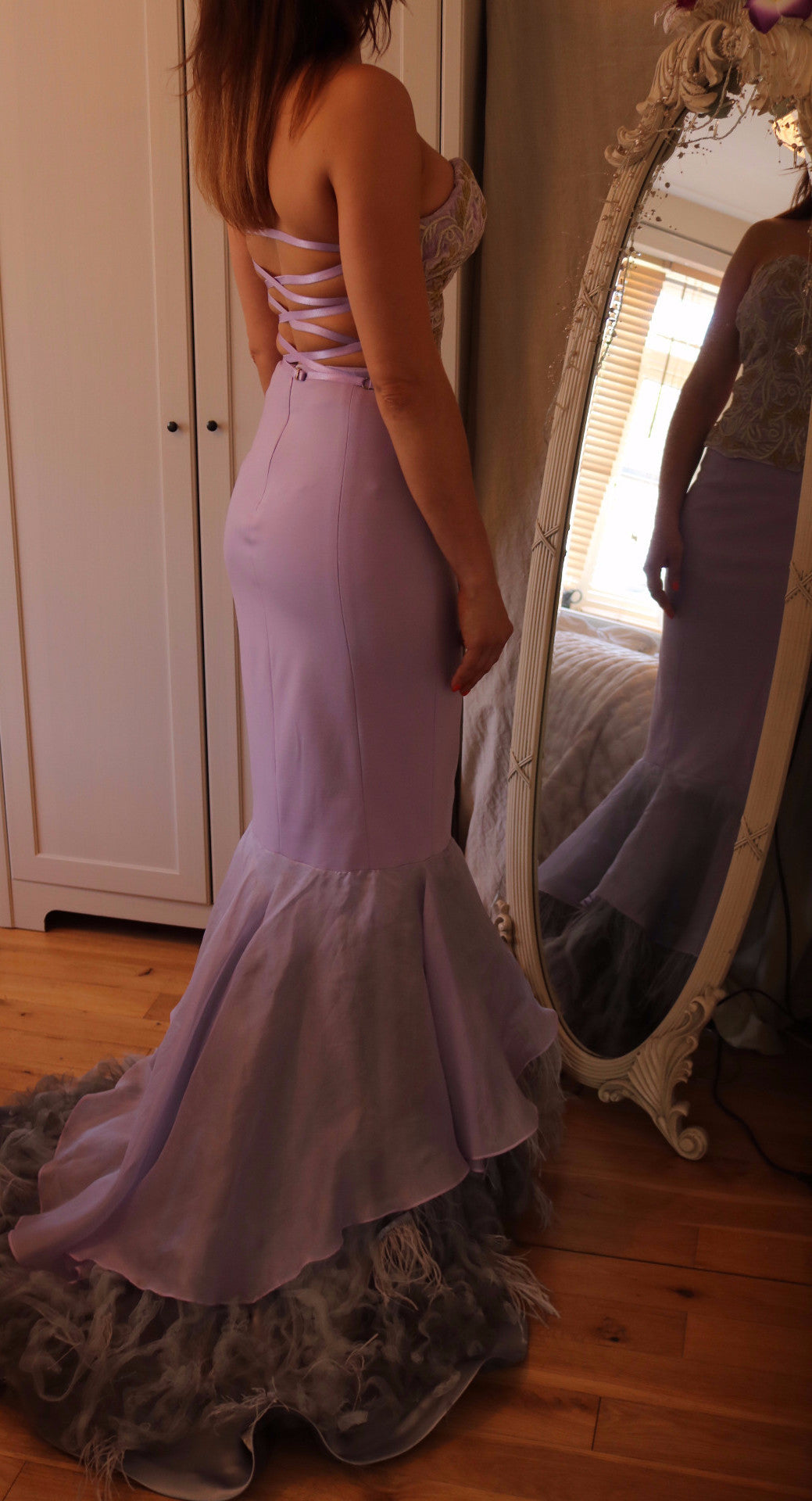 Handmade item Made in England Made to order Custom made dress - price on request Ships worldwide from United Kingdom https://www.etsy.com/uk/shop/VeneraTabakin Materials: taffeta, ostrich feather, lace embroidery appliqué Invisible...